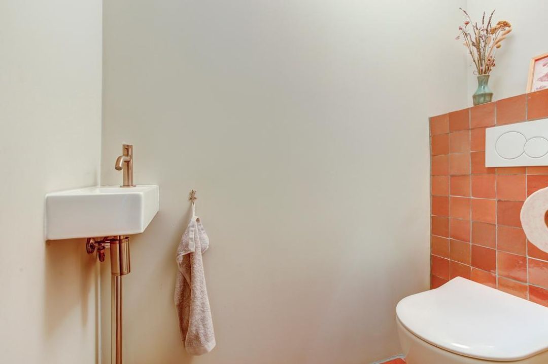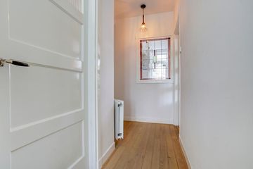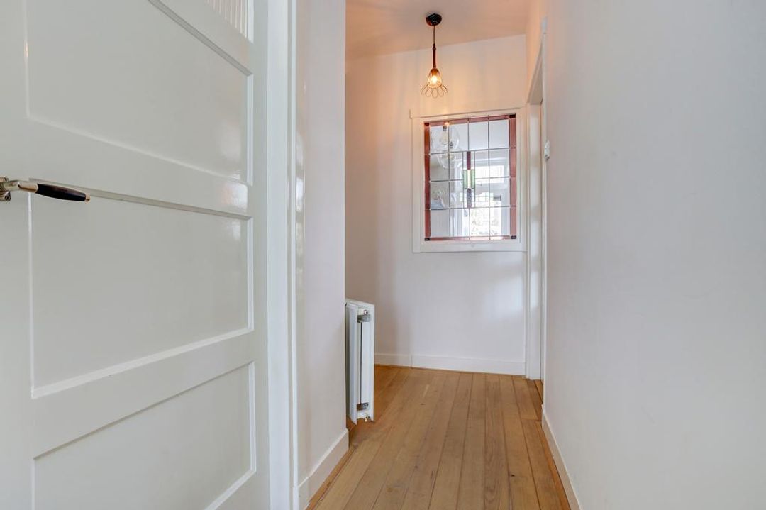 Via de afgesloten hal bereik je de gang die helemaal tot in de uitbouw loopt en toegang biedt tot alle vertrekken. De toegangsdeur naar de voormalige gesloten keuken is vervangen door een glas-in-lood raam voor een fraaie doorkijk naar het keuken/woongedeelte. De toiletruimte in het midden van de woning, naast de 2e slaapkamer is in 2020 vernieuwd. In de gang tref je verder de meterkast/trapkast met extra bergruimte.