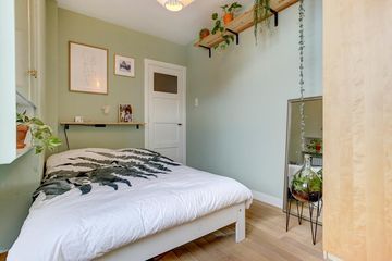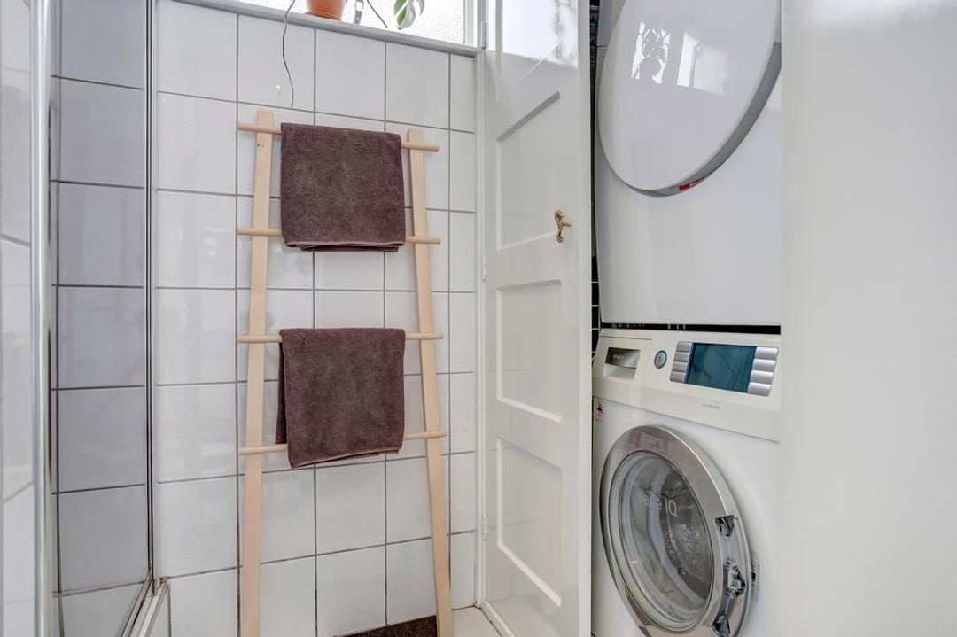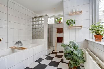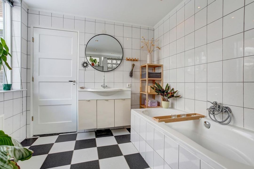 In de uitbouw aan de achterzijde van de woning bevinden zich een ruime 2e slaapkamer met vaste kast voor extra bergruimte en een deur naar de tuin. Achter de slaapkamer tref je de royale badkamer voorzien van bad, douche en wastafelmeubel. Hier bevindt zich tevens een afgesloten (kast)ruimte voor de CV en wasmachine/droger.